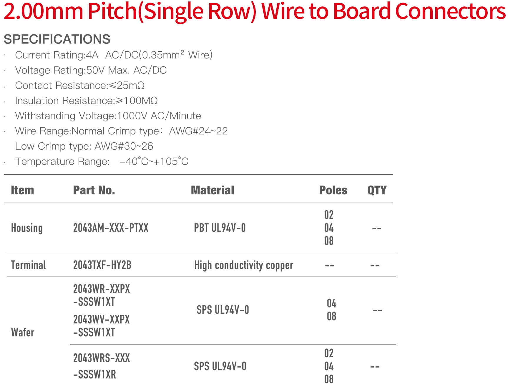 2043 Single Row Series 2.00mm Pitch (.079") 線對板連接器